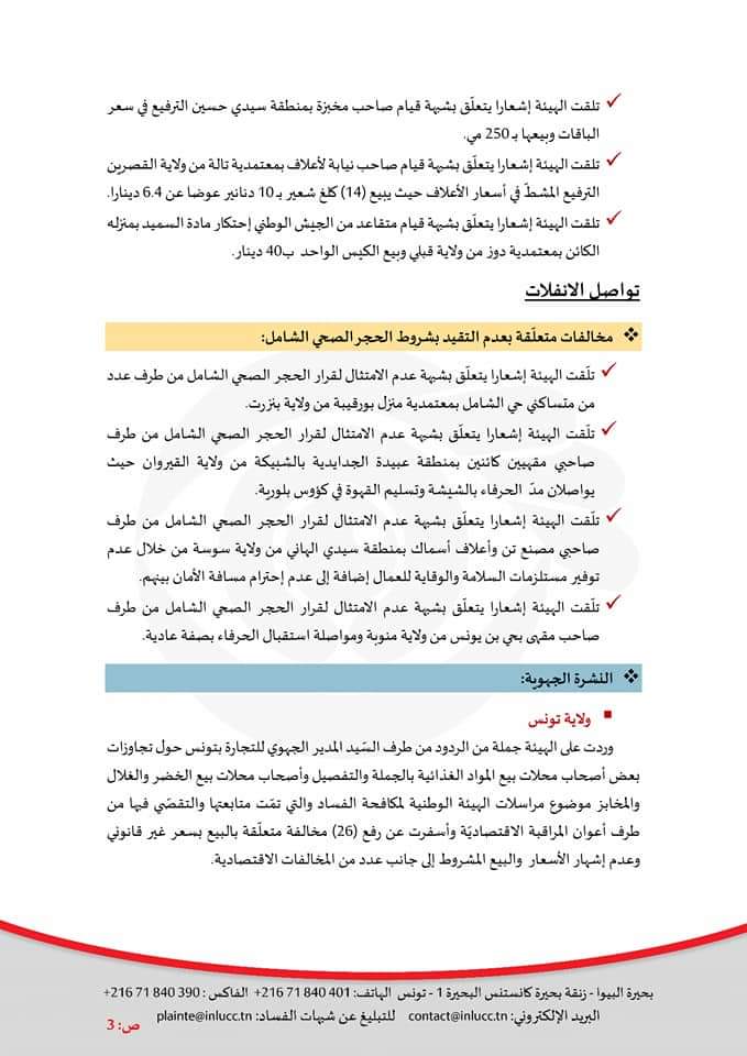 تلقت الهيئة الوطنية لمكافحة الفساد اليوم الخميس 9 أفريل 232 عملية تبليغ منها عن ترفيع بعض المصحات الخاصة في تعريفات الخدمات والأعمال الطبية بنسبةما بين100 و300 دينار بدعوى اقتناء مستلزمات مقاومة فيروس كورونا إلى جانب تلقي الهيئة تبلغيات عن تواصل عمليات التلاعب بالأسعار والاحتكار للمواد الغذائية خاصة السميد والفرينة يمارسها تجار وموظفون شركات .