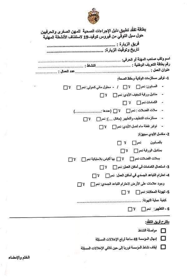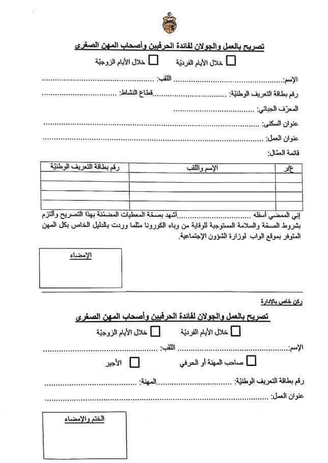 وبالنسبة إلى الحرفيين والمهنيين الذين لم يتمكّنوا من تنزيل الإستمارة فإنّه بإمكانهم تسلّمها من العون المراقب، على أن يقوموا بتعميرها أمامه ويؤشر عليها.