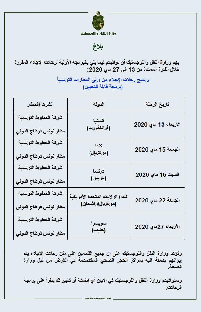أعلنت زارة النقل واللوجستيك عن برمجة رحلات جديدة لإجلاء مواطنين تونسيين من ألمانيا وفرنسا  وسويسرا والولايات المتحدة الأمريكية وكندا، وذلك في الفترة الممتدة من 13 إلى 27 ماي .