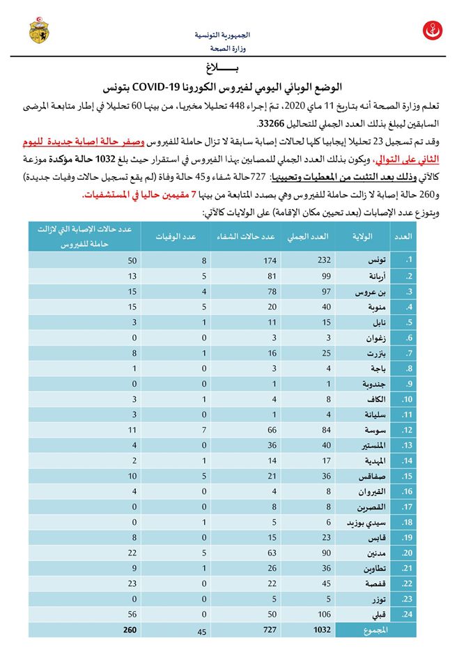 وفق آخر معطيات لوزارة الصحة، فقد بلغ عدد المتعافين من فيروس كورونا إلى غاية تاريخ 11 ماي 2020، 727 حالة شفاء، في حين إنحصر عدد المصابين في 260 مصابا، واستقرّ عدد الوفيات على 45 حالة وفاة.