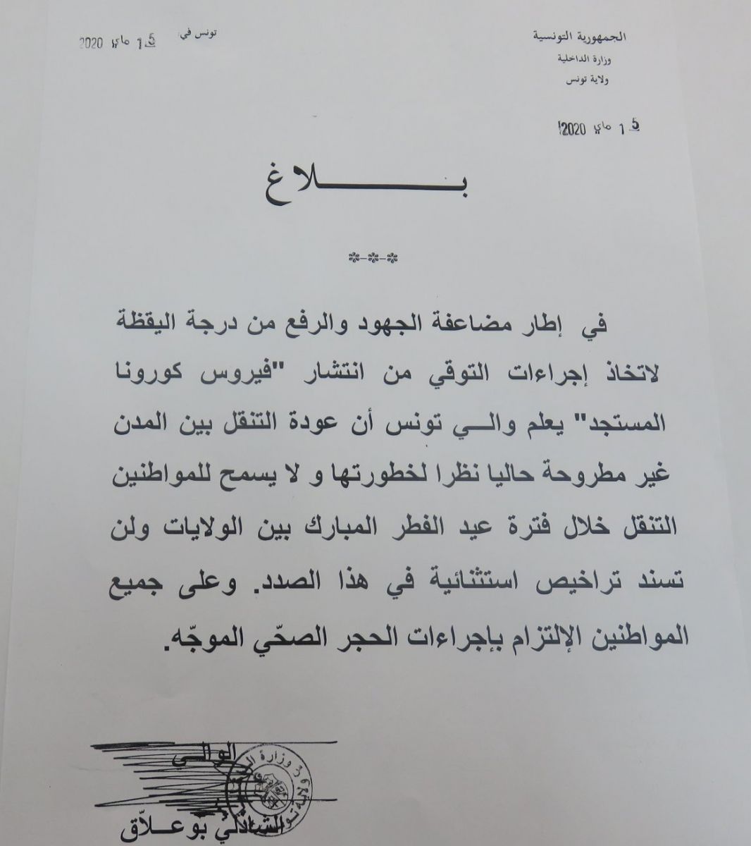 شدد والي تونس الشاذلي بوعلاق، على أن عودة التنقل بين المدن غير مطروحة حاليا نظرا لخطورتها ولا يسمح للمواطنين التنقل خلال فترة عيد الفطر المبارك بين الولايات، ولن تسند تراخيص استثنائية في هذا الصدد، وفق بلاغ للولاية اليوم 15 ماي 2020.