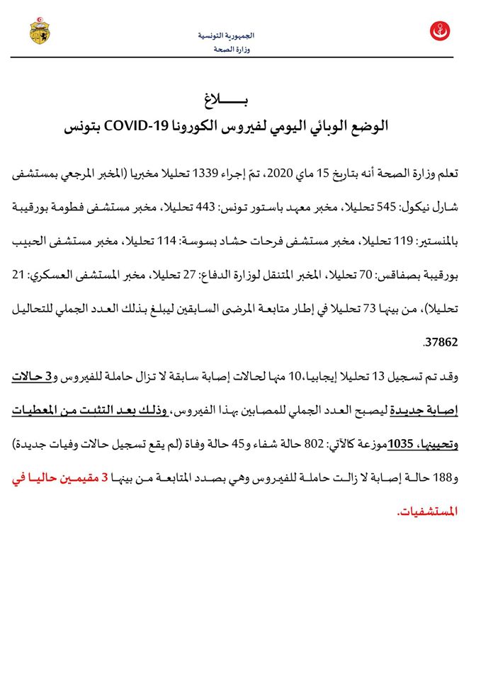 أعلنت وزارة الصحة أنه بتاريخ 15 ماي 2020 تم إجراء 1339 تحليلا مخبريا، مؤكدة تسجيل 13 تحليلا إيجابيا، من بينها 10 إصابات سابقة لاتزال حاملة للفيروس و3 حالات إصابة جديدة ليصبح العدد الجملي للمصابين بالفيروس 1035 حالة.