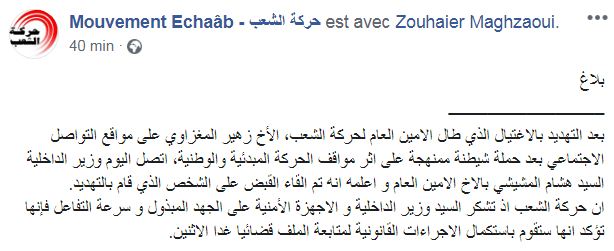 أكّدت حركة الشعب في تدوينة نشرتها على صفحتها بالفيسبوك أنّ وزير الداخليّة هشام المشيشي أبلغ زهير المغزاوي الأمين العام للحركة أنّه تم إلقاء القبض على الشخص الذي هدد باغتياله.