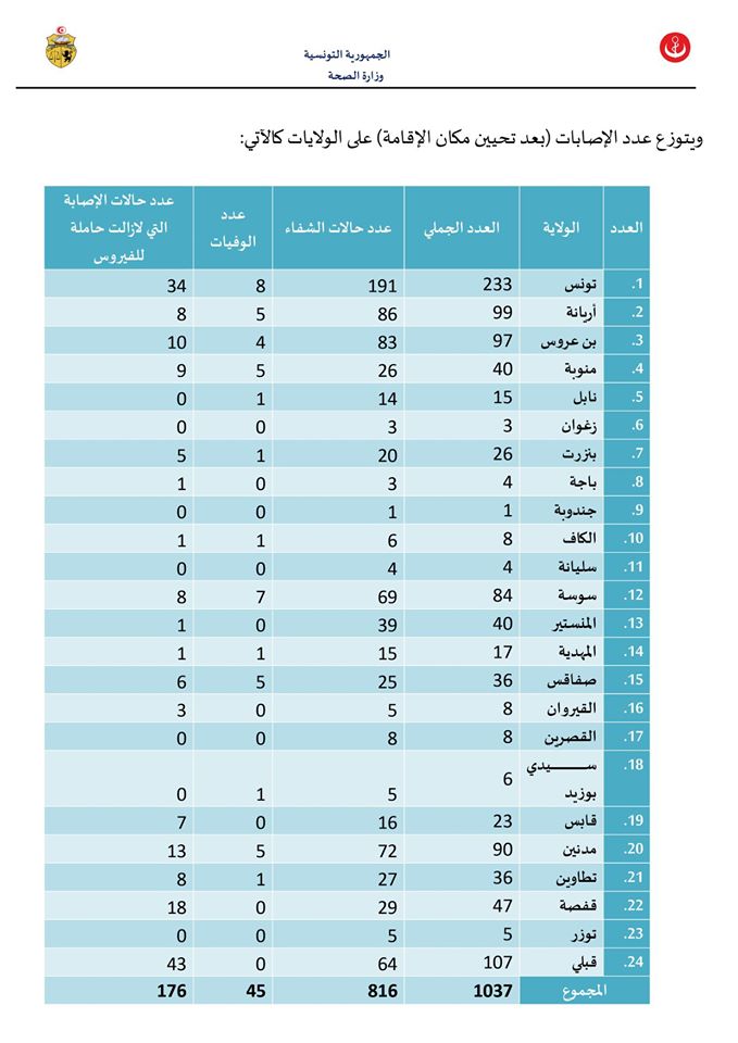 وقد تم تسجيل 9 تحاليل إيجابية كلها لحالات إصابة سابقة لا تزال حاملة للفيروس ليبقى العدد الجملي للمصابين بهذا الفيروس، وذلك بعد التثبت من المعطيات وتحيينها، 1037 حالة موزعة كالآتي: 816 حالة شفاء و45 حالة وفاة (لم يقع تسجيل حالات وفيات جديدة) و176 حالة إصابة لا زالت حاملة للفيروس وهي بصدد المتابعة من بينها 3 مقيمين حاليا في المستشفيات.