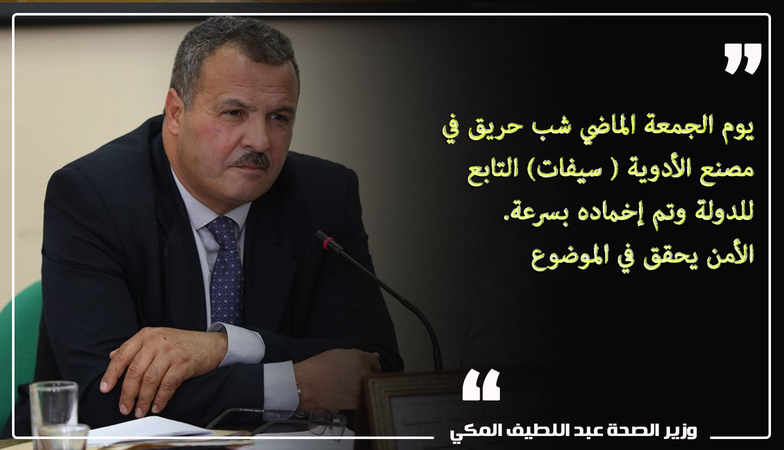 أكد وزير الصحة عبد اللطيف المكي في تدوينة نشرها على صفحيته بموقع التواصل الاجتماعي فيسبوك أن حريقا شب يوم الجمعة الماضي في مصنع الأدوية ( سيفات) التابع للدولة وتم إخماده بسرعة، لافتا إلى أن الأمن يحقق في الموضوع.
