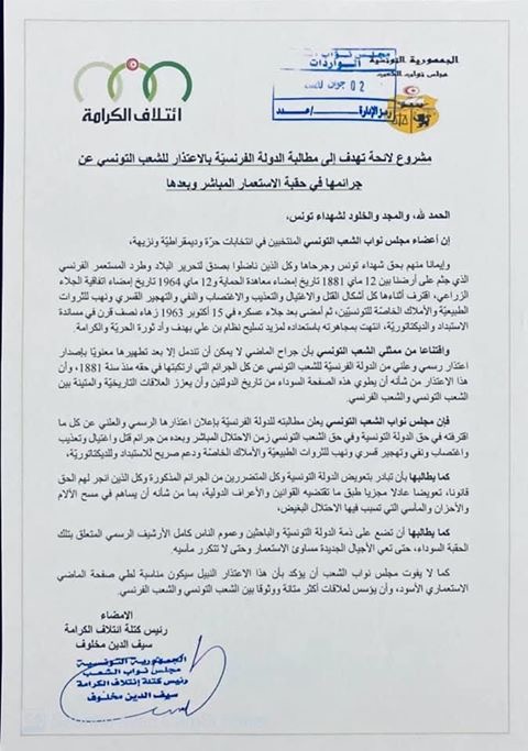 يعقد مجلس نواب الشعب غداً الثلاثاء 9 جوان إبتداءً من الساعة التاسعة صباحاً جلسةً عامة للنظر في مشروع لائحة تقدّمت بها كتلة إئتلاف الكرامة والتي تهدفُ إلى " مطالبة الدولة الفرنسيّة بالاعتذار للشعب التونسي عن جرائمها في حقبة الاستعمار المباشر وبعدها".