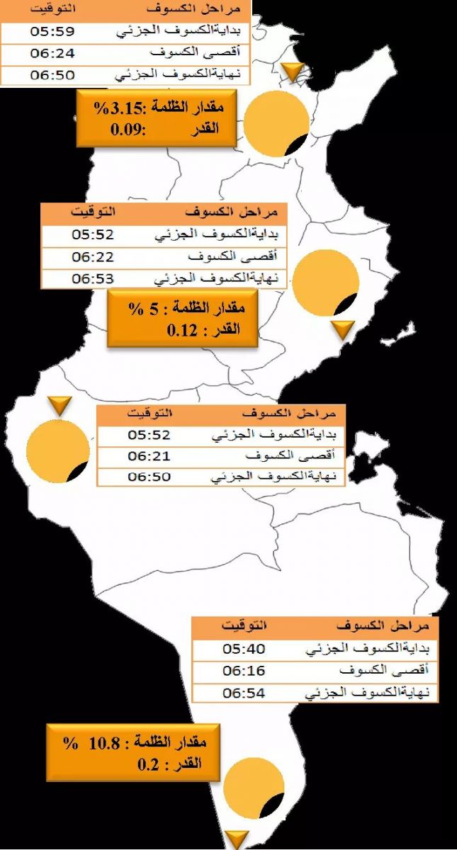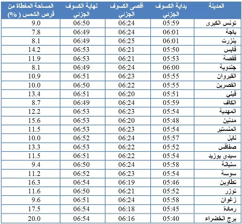 و يكون الكسوف في تونس جزئيا ويمكن متابعته في كامل أنحاء البلاد كما يبينه الجدول الموالي. أما بخصوص مدينة تونس فيمكن مشاهدة الكسوف الجزئي بداية من الساعة الخامسة صباحا و59 دقيقة إلى غاية الساعة السادسة و50 دقيقة مع نسبة مساحة مغطاة من قرص الشمس 9 %.