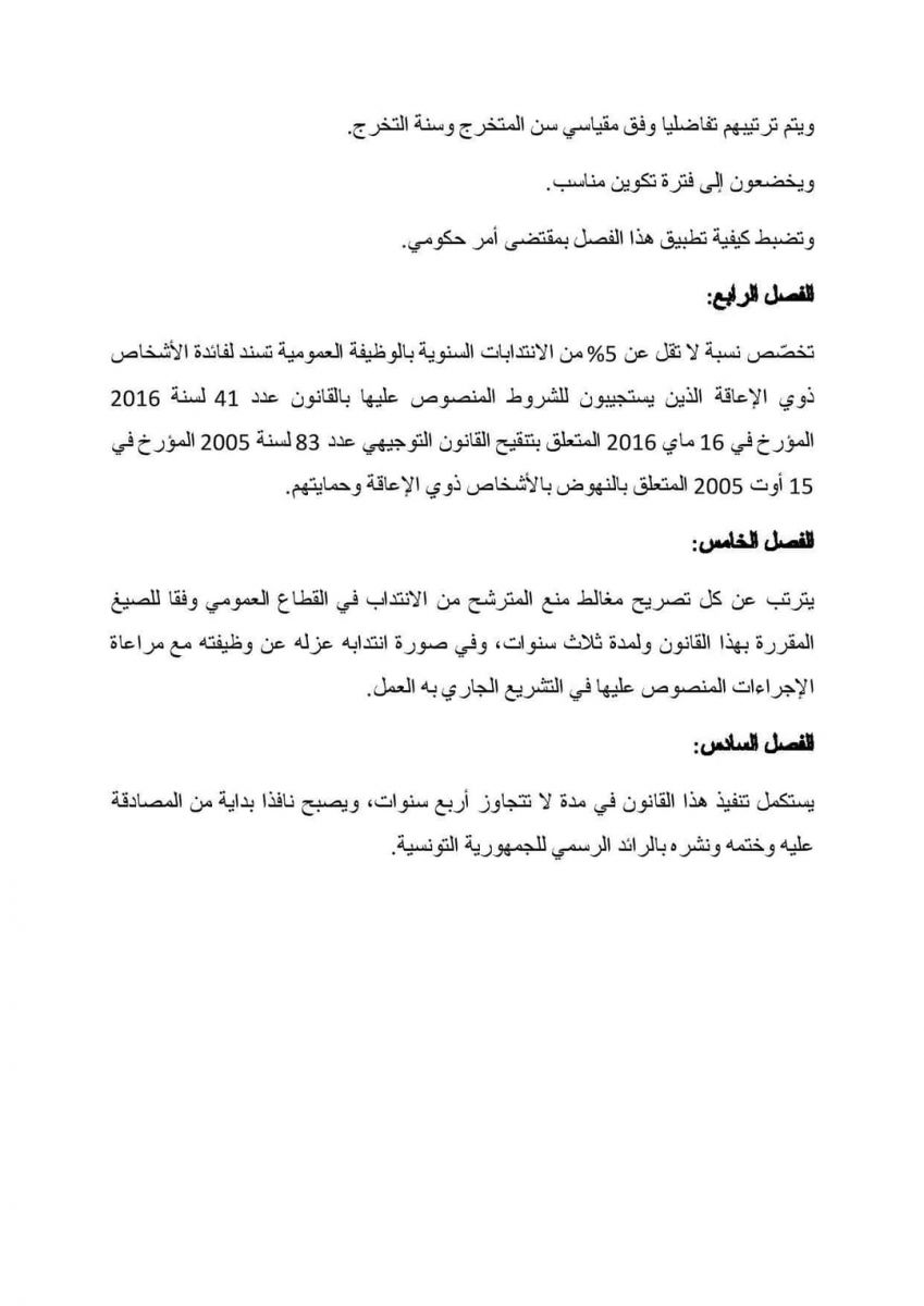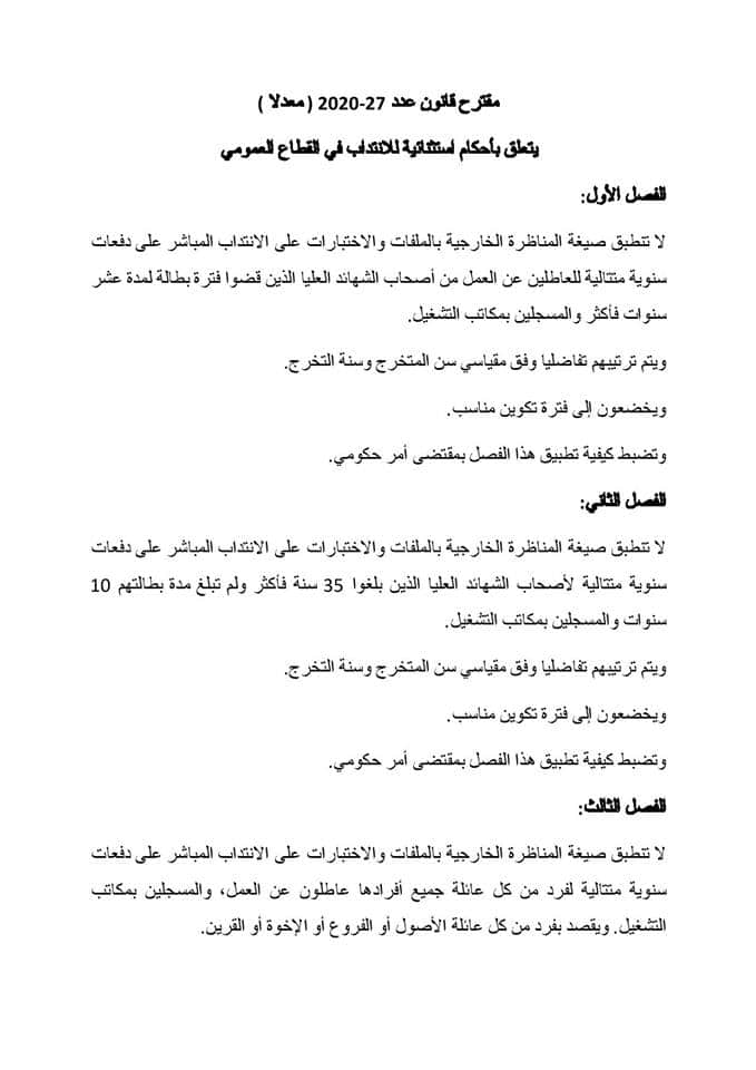 وفي ما يلي نص مقترح القانون المصادق عليه المتعلق بسن أحكام إستثنائية للانتداب في القطاع العمومي :