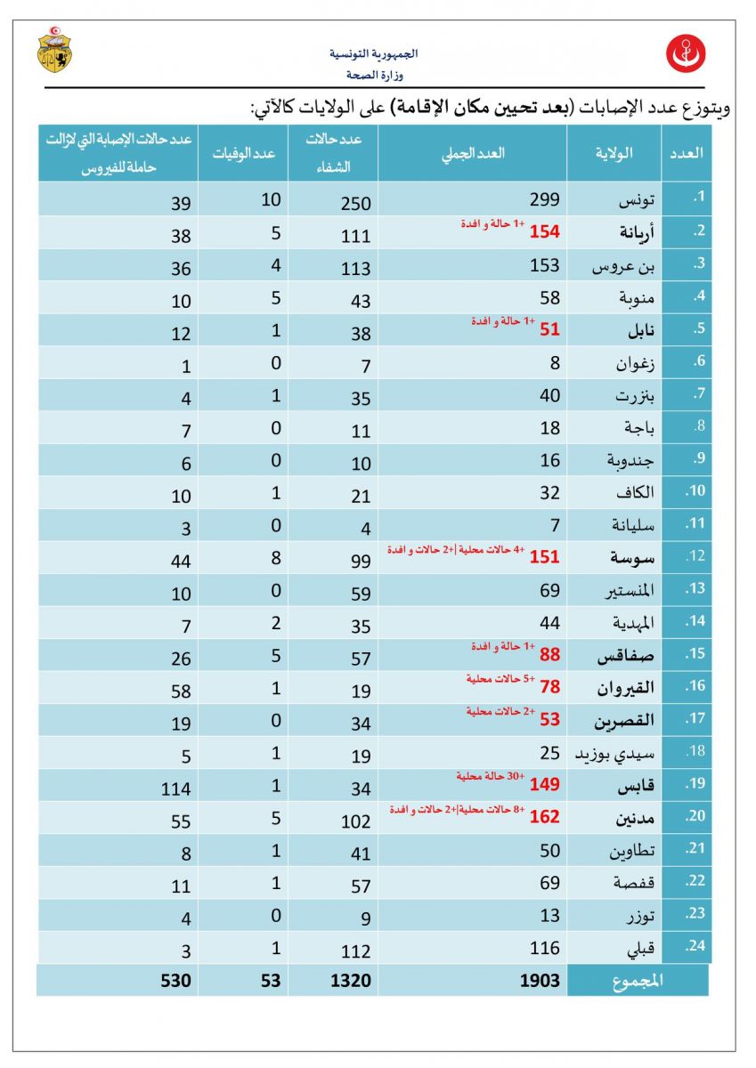 وتم تسجيل 68 تحليلا إيجابيا من بينهم 56 حالة إصابة جديدة: 49 حالة إصابة محلية و7 حالات إصابة وافدة و12 تحليلا إيجابيا لحالات إصابة سابقة لا تزال حاملة للفيروس، ليصبح العدد الجملي للمصابين بهذا الفيروس، وذلك بعد التثبت من المعطيات وتحيينها، 1903 حالة مؤكدة موزعة كالآتي: 1320 حالة شفاء و53 حالة وفاة و530 حالة إصابة لا تزال حاملة للفيروس وهي بصدد المتابعة من بينها 19 حالة إصابة وقع التكفل بها في المستشفى.