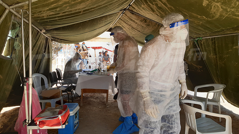 ويشهد المستشفى العسكري الميداني بالحامة تركيز خيمة صحية يشرف عليها طبيب و3 ممرضين يستقبلون المواطنين المشتبه في حملهم لعلامات فيروس كورونا ويتم اجراء تحاليل لفائدة الحالات المشتبه فس اصابتهم بفيروس كورونا بعد استيقاء المعطيات حول وضعياتهم الصحية.