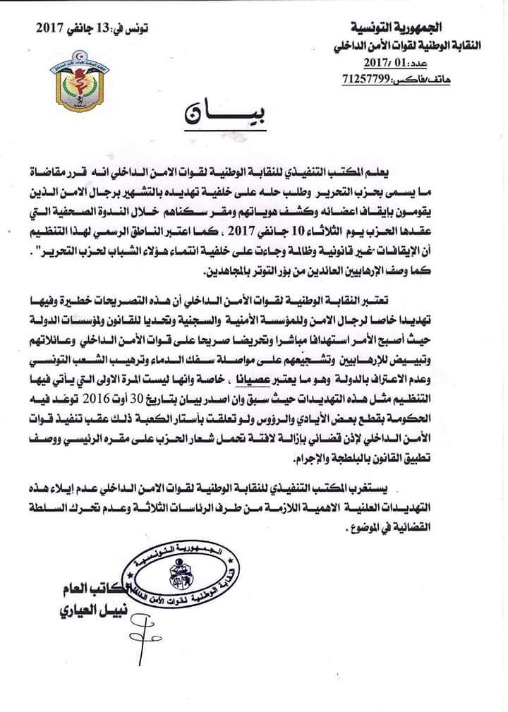 طالب اليوم الجمعة 13 جانفي 2017، المكتب التنفيذي للنقابة الوطنية لقوات الأمن الداخلي عبر بيان له، بحلّ حزب التحرير على خلفية ما اعتبره "تحريضا على الأمنيين وتشجيعا على اغتيالهم في إحدى التصريحات الإعلامية".