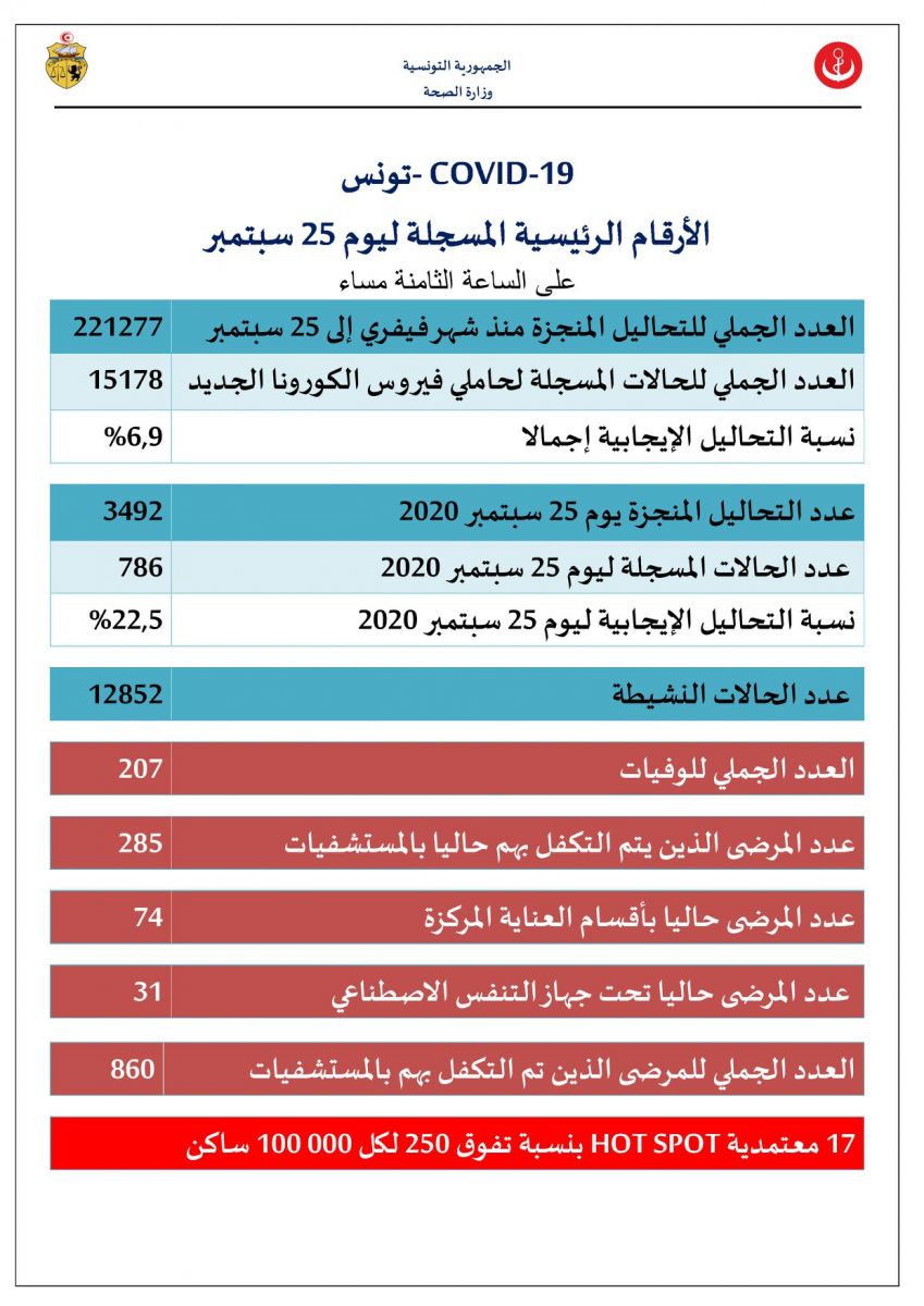 أعلنت وزارة الصحة في بيان تسجيل 786 اصابة جديدة بفيروس كورونا بتاريخ 25 سبتمبر 2020 ليرتفع إجمالي الإصابات بالفيروس إلى 15178.