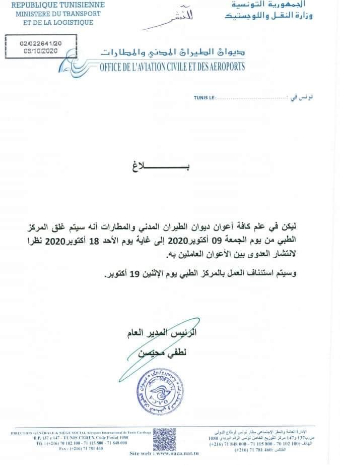 أعلن ديوان الطيران المدني والمطارات أنّه تم غلق المركز الطبي اليوم الجمعة 9 أكتوبر 2020 وسيتواصل الغلق إلى غاية الـ18 من الشهر ذاته بعد انتشار فيروس كورونا في صفوف العاملين بالمركز .