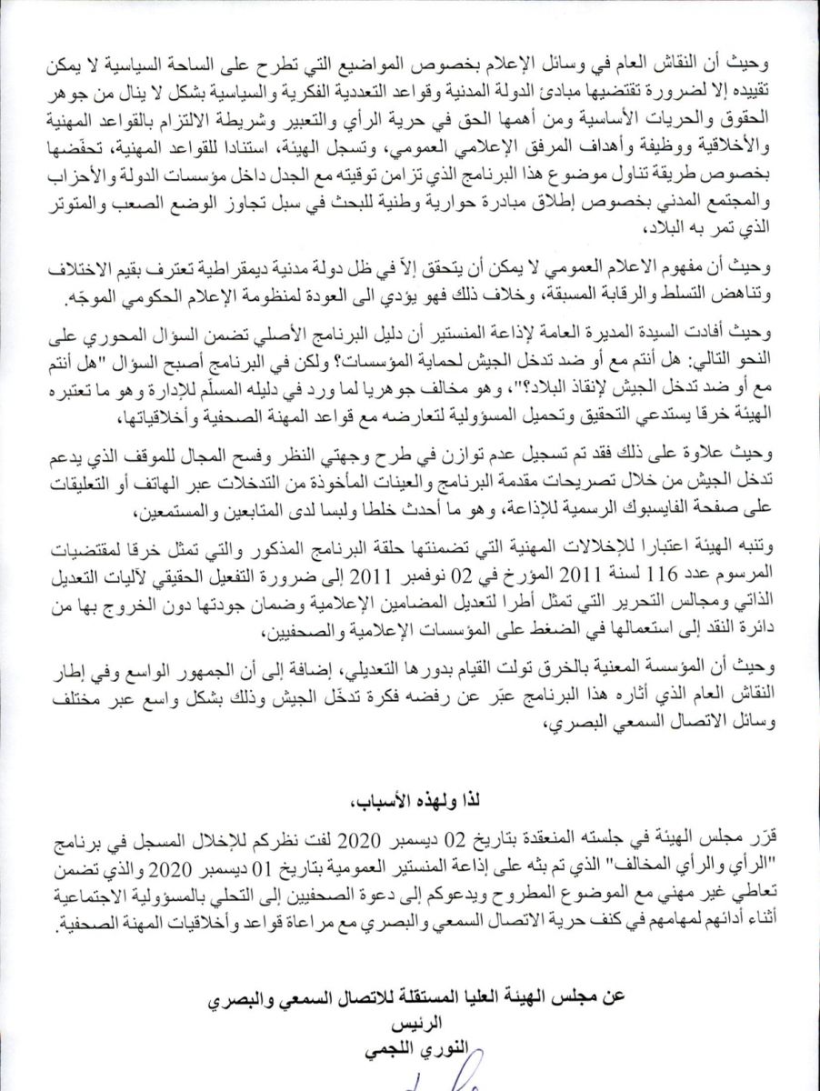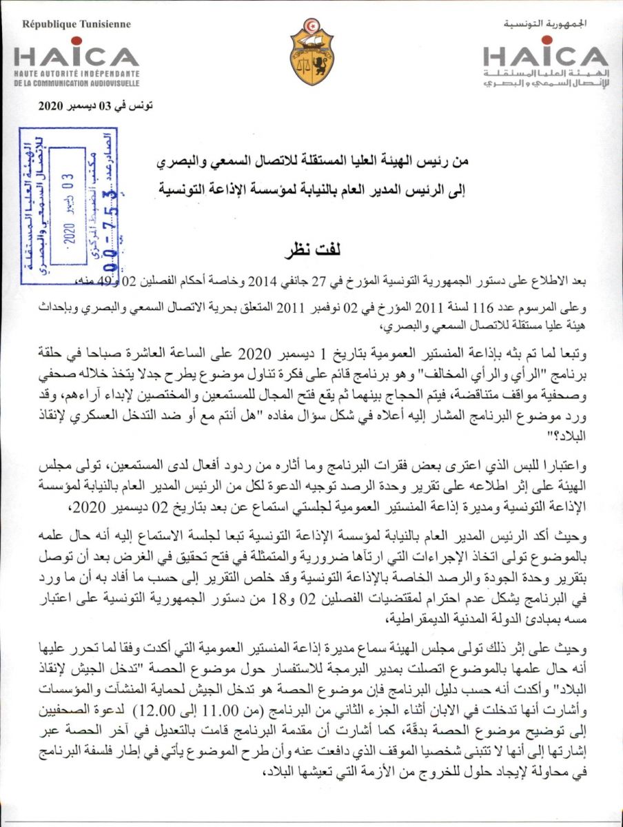 وجهت الهيئة العليا المستقلة للاتصال السمعي والبصري، اليوم 03 ديسمبر 2020، لفت نظر لمؤسسة الإذاعة التونسية، وذلك في علاقة بالإخلال المسجل في برنامج "الرأي والرأي المخالف" الذي تم بثه على إذاعة المنستير العمومية بتاريخ 01 ديسمبر 2020 والذي تضمن "تعاطي غير مهني مع موضوع الحصة" الذي كان حول "تدخل الجيش لإنقاذ البلاد"، وذلك اعتبارا للبس الذي اعترى بعض فقرات البرنامج وما أثاره من ردود أفعال لدى المستمعين أمام فسح المجال للموقف الذي يدعم تدخل الجيش.