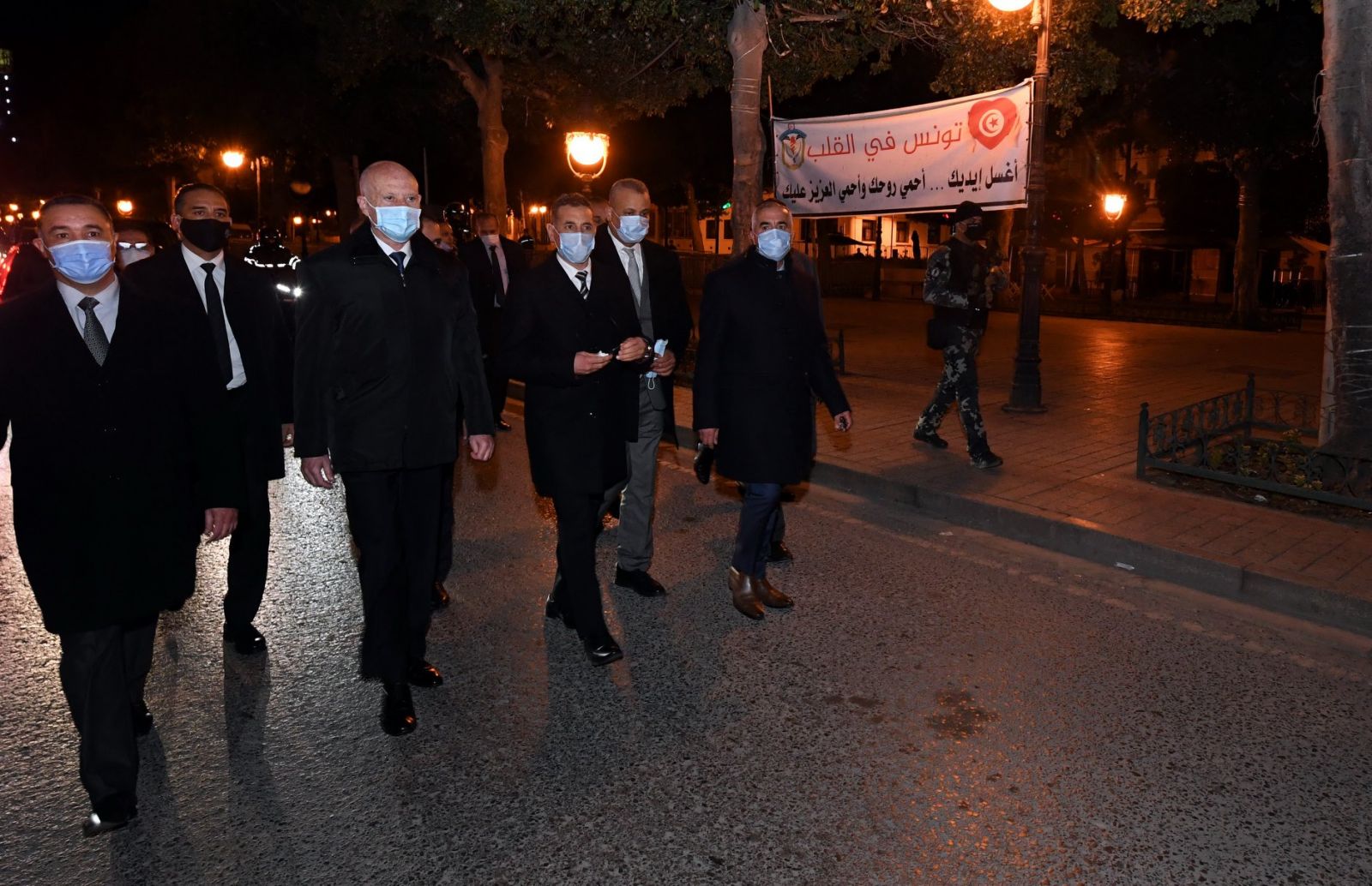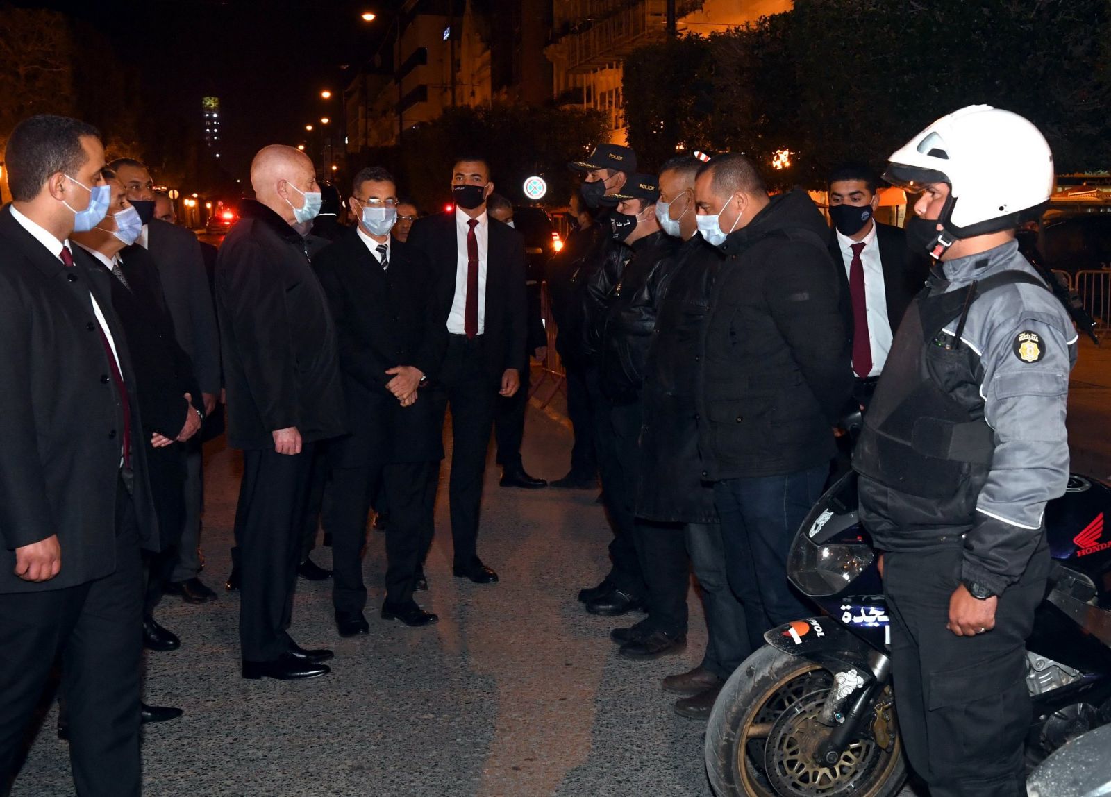 وإثر ذلك قام رئيس الدولة بجولة بشارع الحبيب بورقيبة بالعاصمة التقى خلالها عددا من أعوان الأمن الساهرين على ضمان تطبيق القوانين والإجراءات المعلنة في هذه الفترة توقيا من تفشي جائحة كورونا وضمانا للحفاظ على صحة الجميع. وتوجه لهم بالشكر مسديا تشجيعاته لهم لمواصلة اليقظة من أجل حماية بلادنا من جميع المخاطر المحتملة.