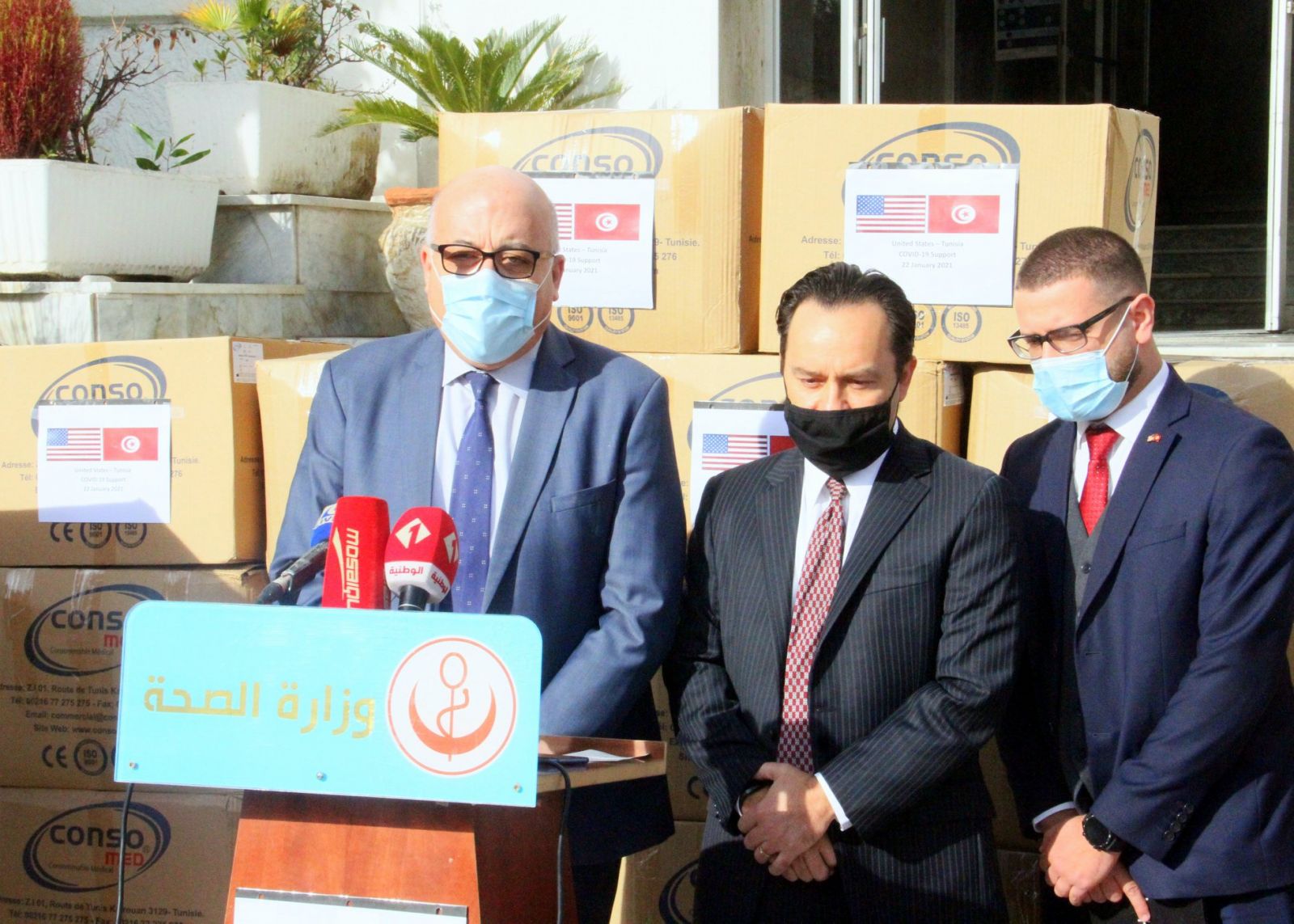 كما انتظم على هامش هذا اللقاء موكب تمّ خلاله تسليم هبة من الولايات المتحدة الأمريكية تشتمل على كميات هامة من مستلزمات الحماية الفردية لفائدة مهنيي الصحة مخصصة لكل من المستشفى الجهوي ببن قردان والمستشفى المحلي برمادة وتعدّ هذه الهبة القسط الأخير من إجمالي المساعدات التي قدمتها الحكومة الأمريكية لدعم جهود تونس في مجابهة جائحة كوفيد-19 منذ مارس 2020 والتي فاقت قيمتها 36 مليون دولار.