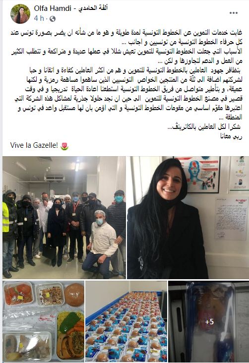أعلنت الرئيسة المديرة العامة للخطوط التونسية ألفة الحامدي، اليوم، عن استئناف مصنع الخطوط التونسية للتموين لخدماته، وذلك في منشور على صفحتها الرسمية على فايسبوك.