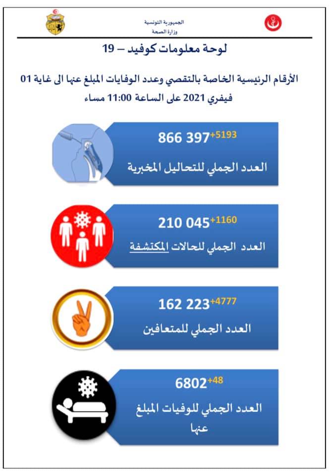 أعلنت وزارة الصحة تسجيل 1160 إصابة جديدة بفيروس كورونا خلال الأربع والعشرين ساعة الماضية ليرتفع اجمالي الإصابات إلى 210 آلاف و45 إصابة.
