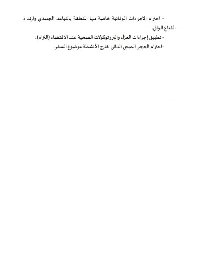 وتشمل هذه الحالات أسبابا قاهرة اما عائلية أو صحية أو مهينة مع ضرورة الاستظهار بالوثائق المطلوبة والمؤيدات التي تثبت ضرورة الاعفاء من الحجر مع الاستظهار بتحليل سلبي لفيروس كورونا تم اجراؤه في حدود 72 ساعة عند تسجيل السفر.