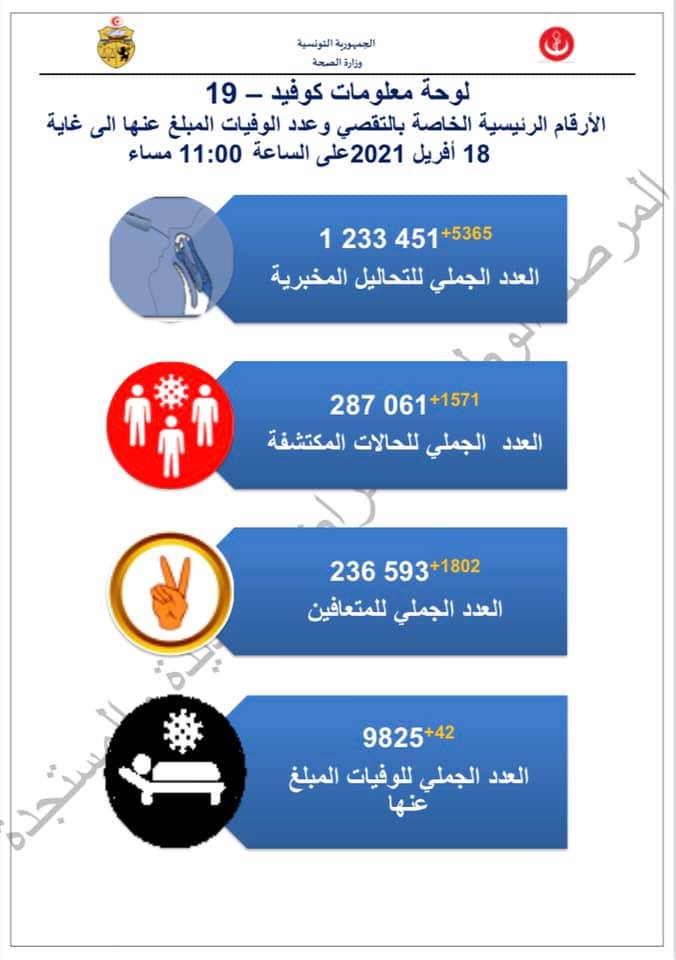 أعلنت وزارة الصحة في بيانها اليوم، عن تسجيل 1571 إصابة جديدة بفيروس كورونا و42 وفاة ، وذلك في الأرقام الرئيسية الخاصة بالتقصي وعدد الوفيات المبلغ عنها إلى غاية 18 أفريل 2021.