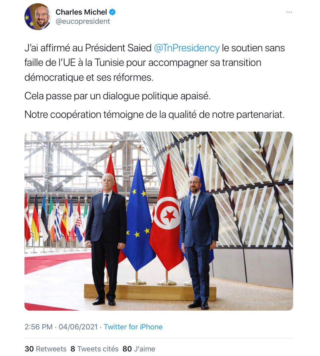 جدّد رئيس المجلس الأوروبي شارل ميشال في تدوينة نشرها على حسابة الرسمي بتويتر عقب إجتماعه أوّل أمس الجمعة 4 جوان 2021 ببروكسيل رئيس الجمهورية قيس سعيّد تأكيده لرئيس الجمهورية دعم الإتّحاد الأوروبي الثابت والكامل ( بلا تردّد) لتونس من أجل مرافقة الإنتقال الديمقراطي والإصلاحات فيها.