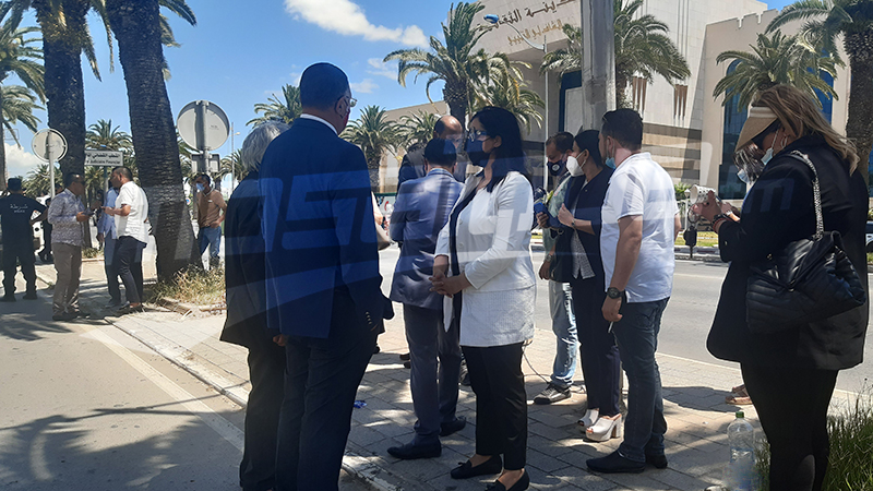 تجمّع عدد من قيادات حزب قلب تونس أمام القطب القضائي المالي والاداري اليوم الاثنين 7 جوان 2021 لمساندة نبيل القروي المعتصم داخل مكتب قاضي التحقيق والرافض للعودة الى السجن،
