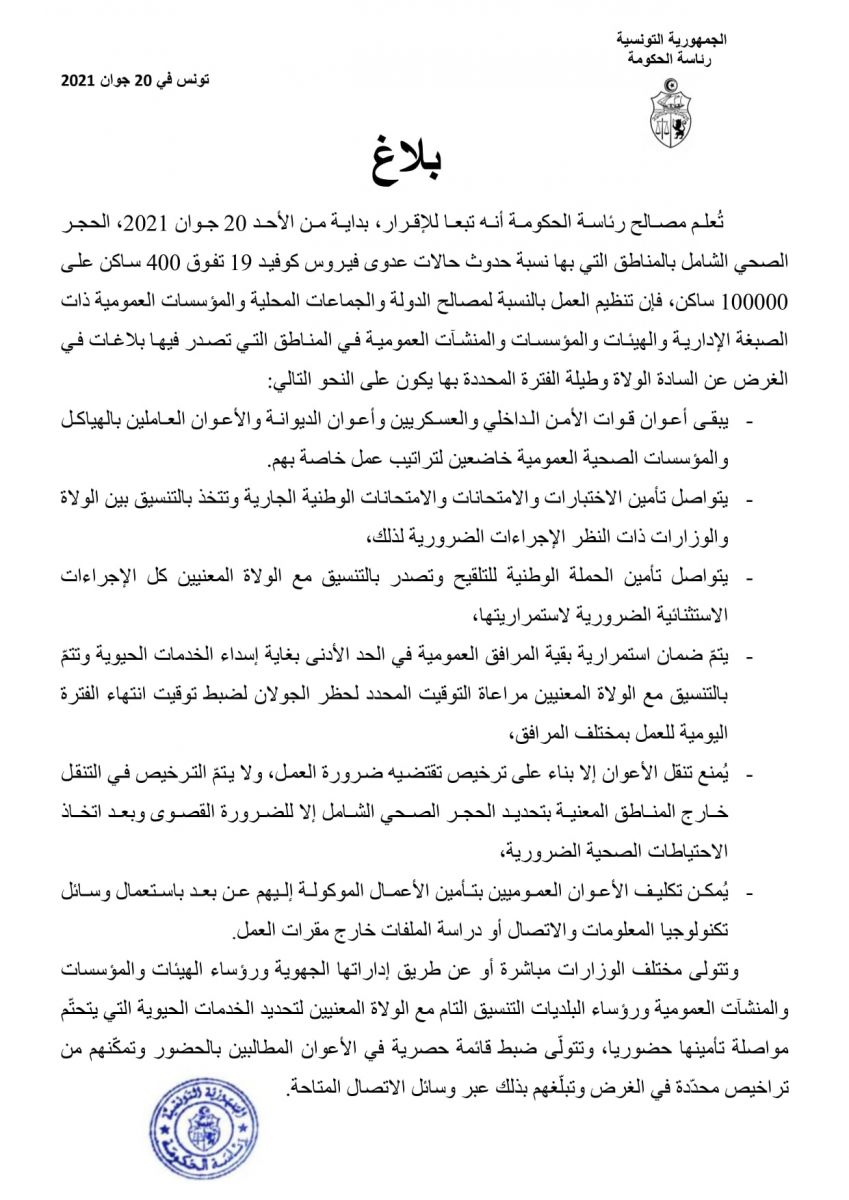 أعلنت وزارة الوظيفة العمومية في بلاغ عن تنظيم العمل في المؤسسات والمنشآت العمومية والإدارات بالولايات المعنية بالحجر الصحي الشاملي.