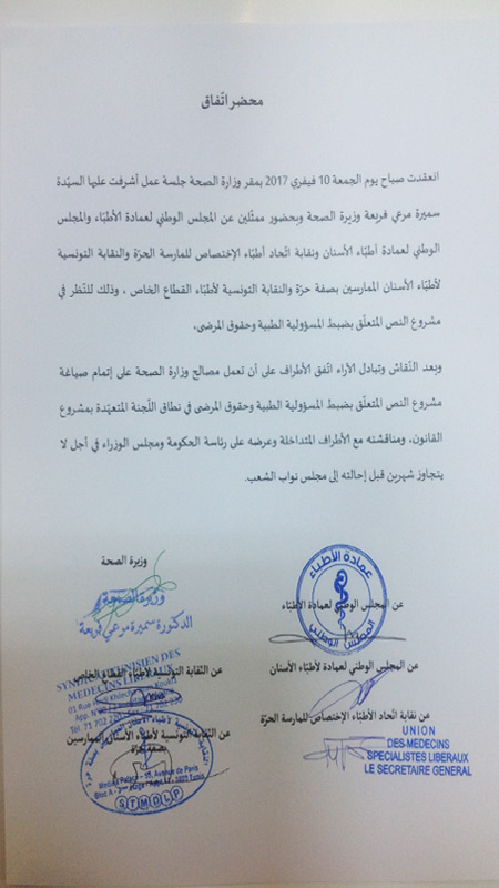 وبعد النقاش وتبادل الآراء إتّفق الأطراف على أن تعمل مصالح وزارة الصحّة على إتمام صياغة مشروع النصّ المتعلّق بضبط المسؤوليّة الطبيّة وحقوق المرضى في نطاق اللجنة المتعهّدة بمشروع القانون، ومناقشته مع الأطراف المتداخلة وعرضه على رئاسة الحكومة ومجلس الوزراء في أجل لا يتجاوز شهرين قبل إحالته إلى مجلس نواب الشعب.