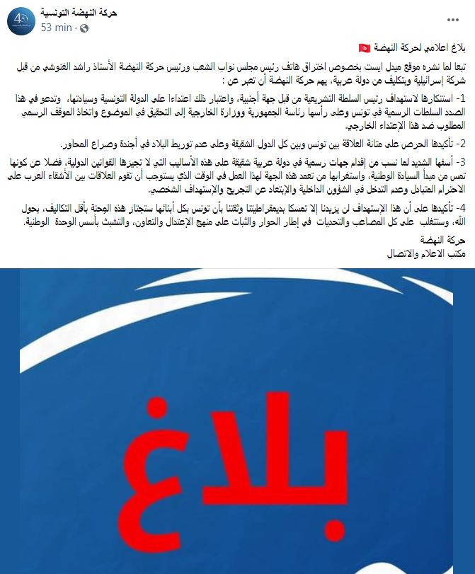 في ردّها على ما تمّ نشره في موقع ميدل ايست بخصوص اختراق هاتف رئيس حركة النهضة راشد الغنوشي من قبل شركة إسرائيلية وبتكليف من دولة عربية، عبّرت الحركة في بلاغ لها اليوم السبت 7 جوان 2021، عن استنكارها ''لاستهداف رئيس السلطة التشريعية من قبل جهة أجنبية''.