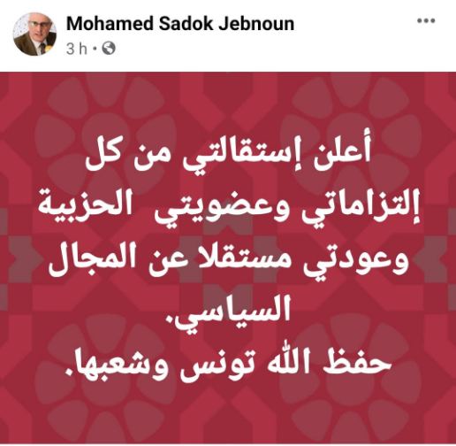 وكتب جبنون في تدوينة نشرها على موقع التواصل الاجتماعي فيسبوك استقالته من حزب قلب تونس، "أعلن استقالتي من كل التزاماتي وعضويتي الحزبية وعودتي مستقلًا عن المجال السياسي..'
