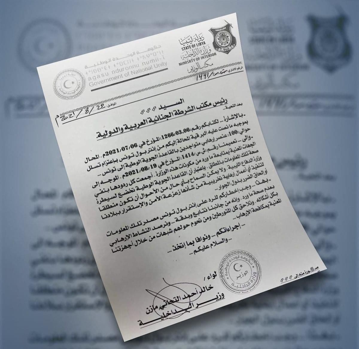 نفى وزير الداخلية الليبي اللواء خالد مازن في رسالة وجّهها إلى رئيس مكتب الشرطة الجنائية العربية والدولية، وجود 100 عنصر إرهابي في قاعدة الوطية بصدد الاستعداد للدخول إلى تونس، وذلك إثر القيام بالتّحريات اللازمة من طرف المصالح الأمنية.