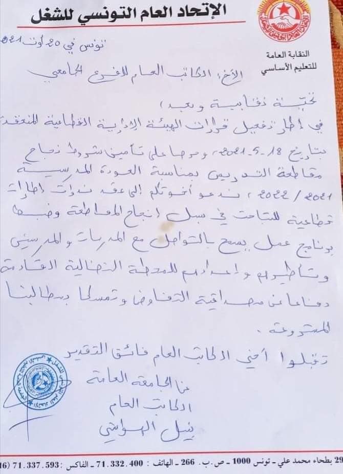 دعا كاتب عام جامعة التعليم الاساسي نبيل الهواشي منظوريه في الفروع الجامعية الجهوية إلى الاستعداد لمقاطعة العودة المدرسية تجسيما لقرارات الهيئة الإدارية المنعقدة 18 ماي 2021 و ذلك من خلال عقد ندوات اطارات قطاعية للتباحث في سبل إنجاح المقاطعة و ضبط برنامج عمل يسمح بالتواصل مع المدرسين و المدرسات.