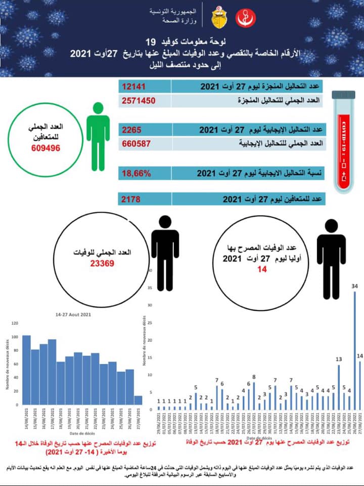 أعلنت وزارة الصحة تسجيل 14 وفاة جديدة بفيروس كورونا بتاريخ 27 أوت 2021.