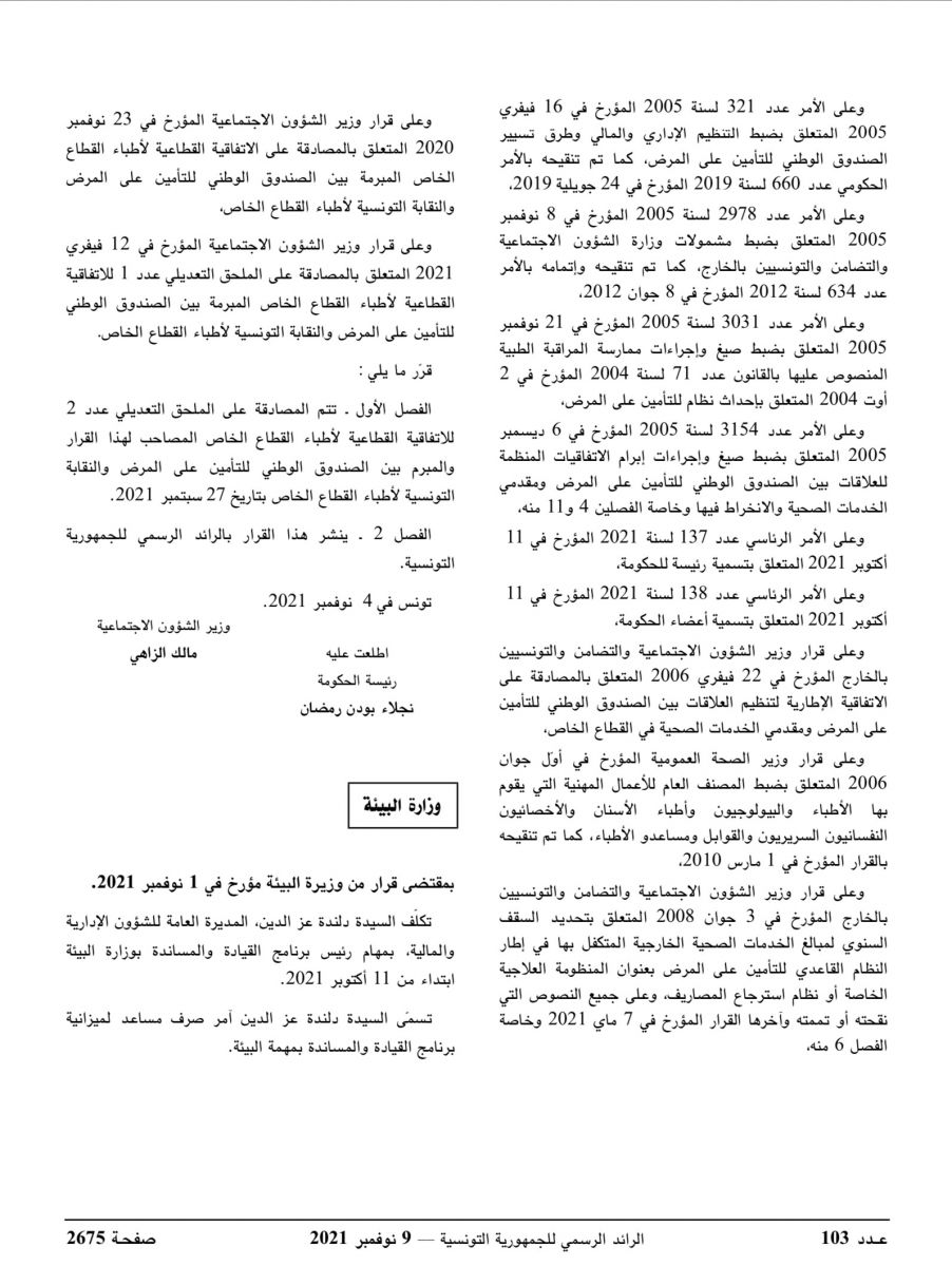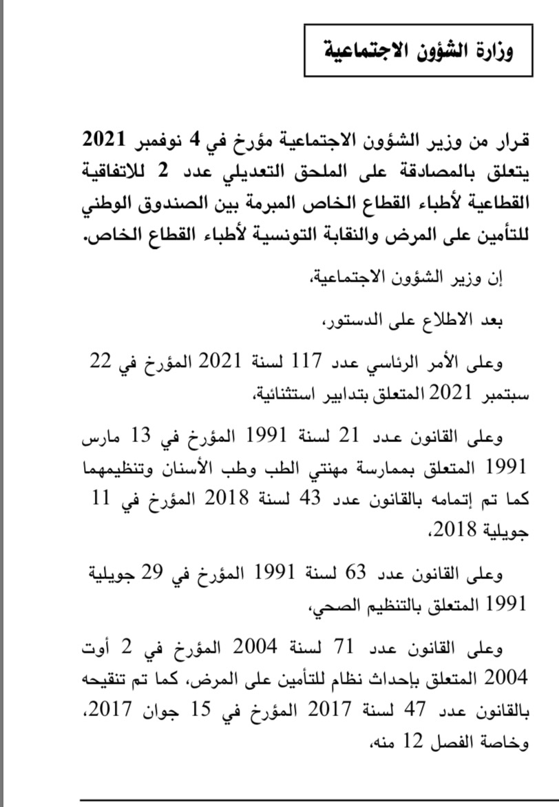 صدر بالرائد الرسمي للجمهورية التونسية قرار من وزير الشؤون الاجتماعية مؤرخ في 4 نوفمبر 2021 يتعلق بالمصادقة على الملحق التعديلي عدد 2 للاتفاقية القطاعية لأطباء القطاع الخاص المبرمة بين الصندوق الوطني للتأمين على المرض والنقابة التونسية لأطباء القطاع الخاص.
