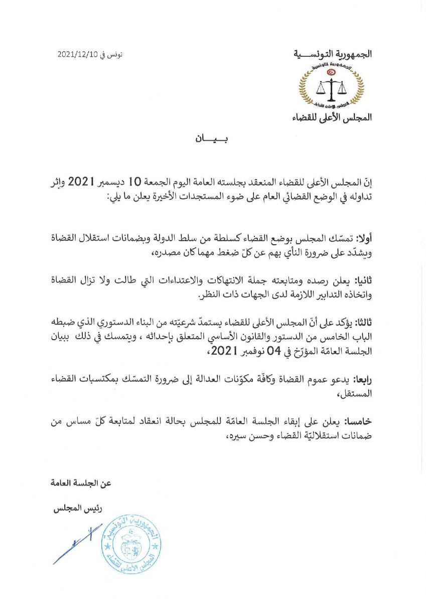 قرر المجلس الأعلى للقضاء الإبقاء على جلسته العامة بحالة انعقاد لمتابعة ''كل مساس بضمانات استقلالية القضاء''، حسب ما جاء في بيان نشره اليوم الجمعة 10 ديسمبر 2021.‎‎