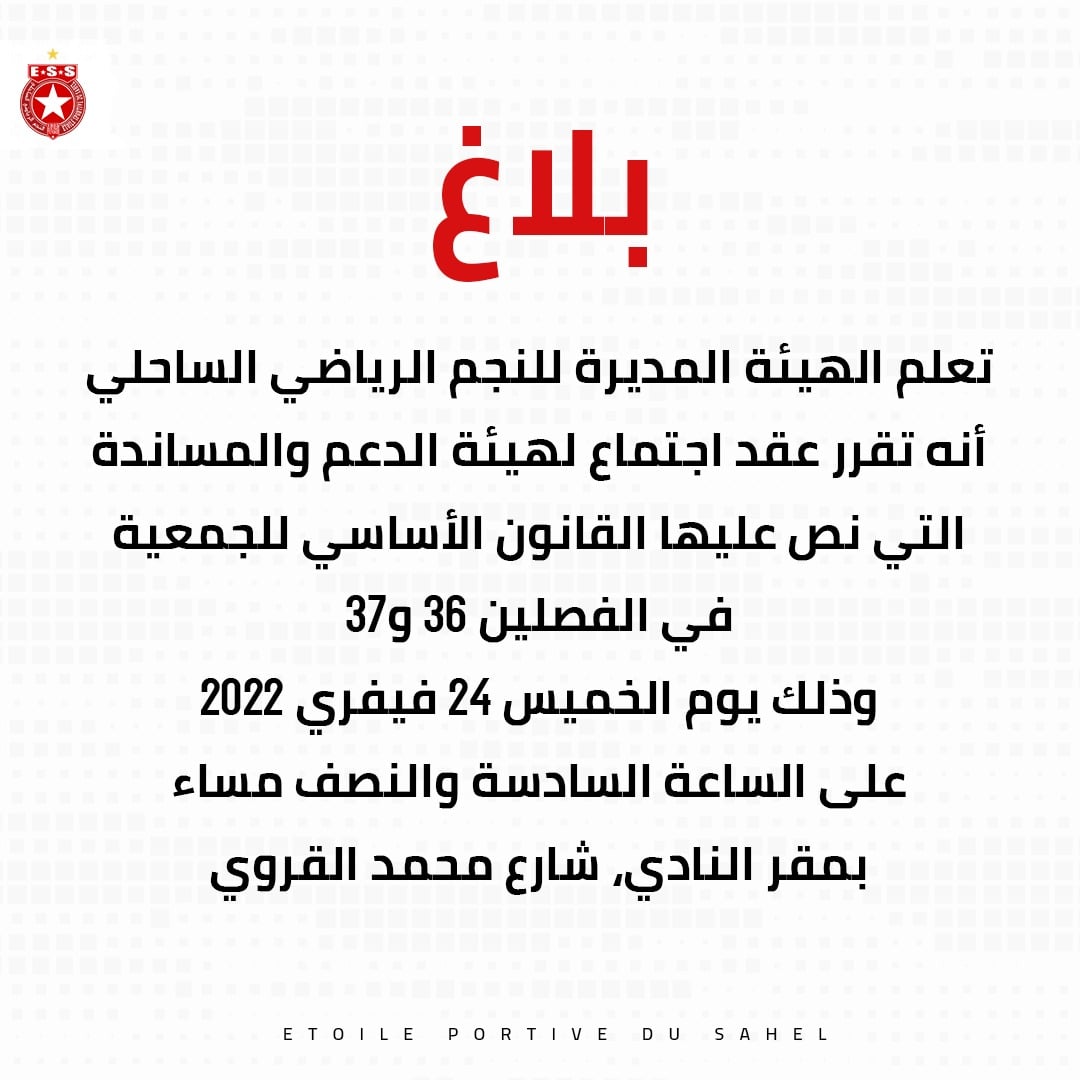 أعلنت الهيئة المديرة للنجم الرياضي الساحلي، في بلاغ لها اليوم الإثنين 21 فيفري 2022، أنّه تقرّر عقد اجتماع لهيئة الدعم والمساندة، التي نصّ عليها القانون الأساسي للجمعية في الفصلين 36 و37، وذلك يوم الخميس 24 فيفري الجاري على الساعة السادسة والنصف مساء بمقر النادي، شارع محمد القروي.