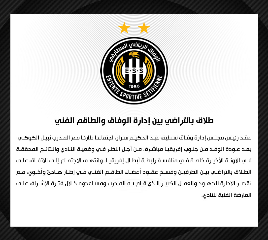 وذكر وفاق سطيف في بيان له ان قرار القطيعة كان بالتراضي بين الطرفين وفسخ ايضا عقود مساعدي الكوكي مع شكره على العمل الكبير الذي قام به خلال فترة اشرافه على النادي في الشنتوات الثلاث الاخيرة .