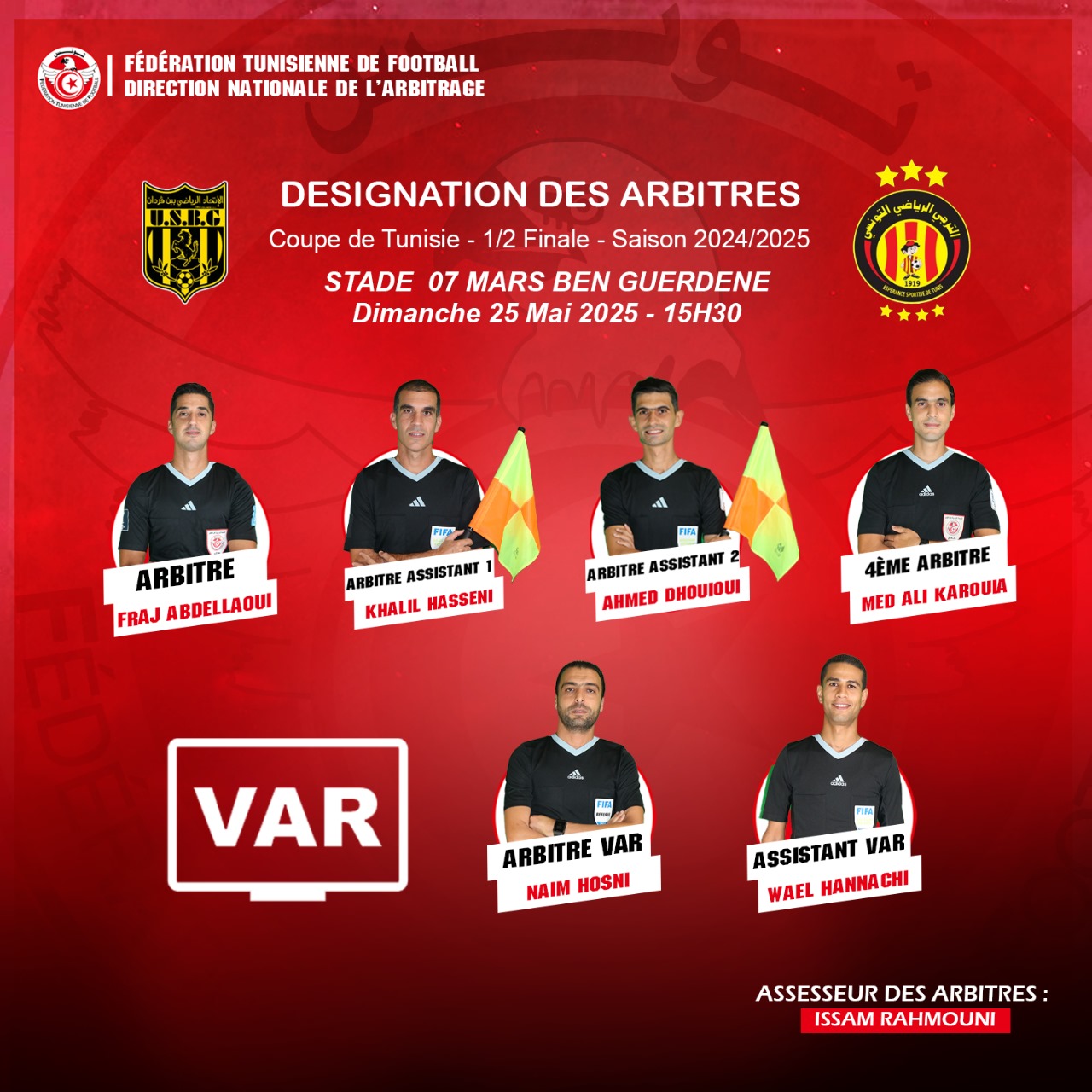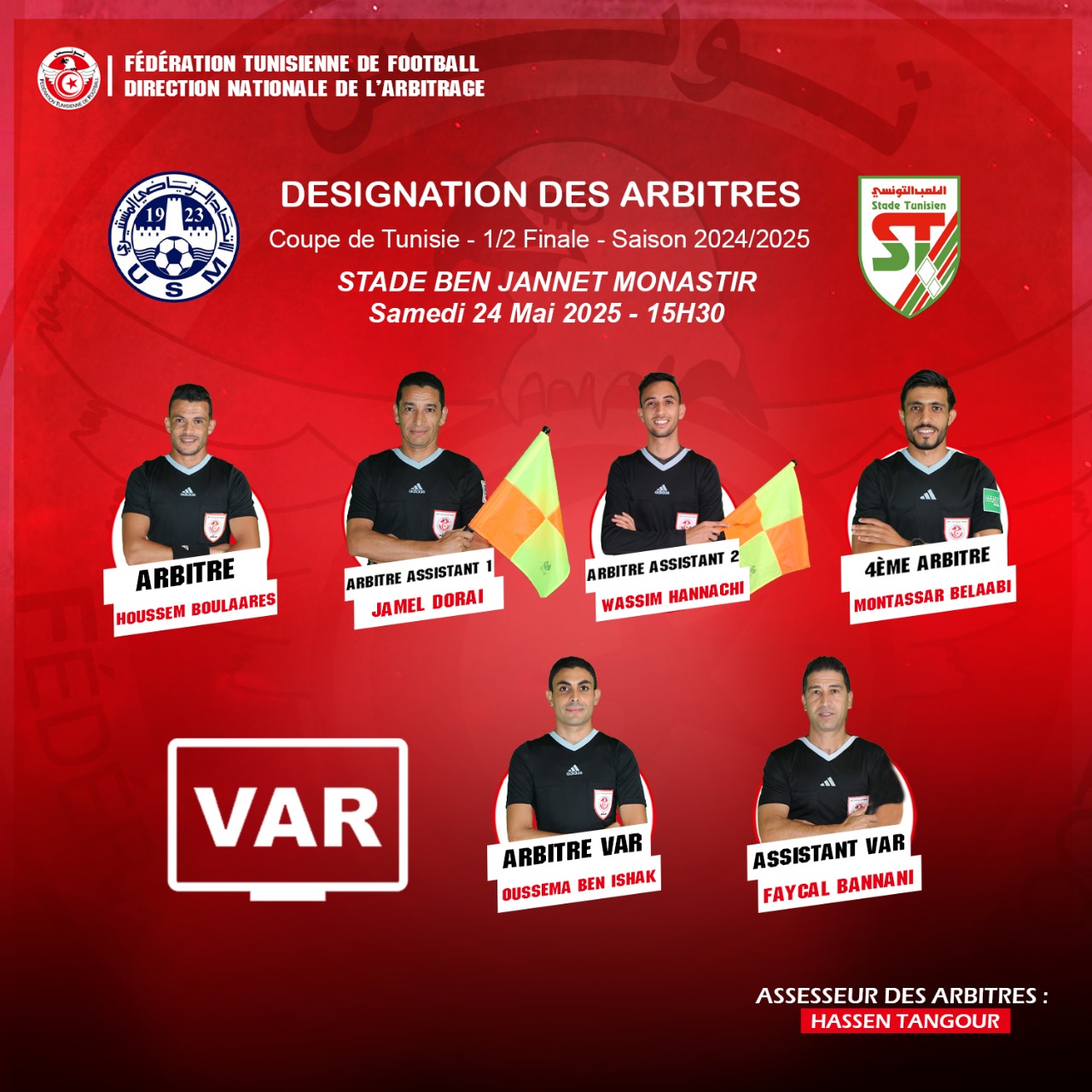 كشفت الإدارة الوطنية للتحكيم اليوم الخميس عن قائمة حكام مباراتي نصف نهائي كأس تونس نهاية هذا الأسبوع على النحو التالي: