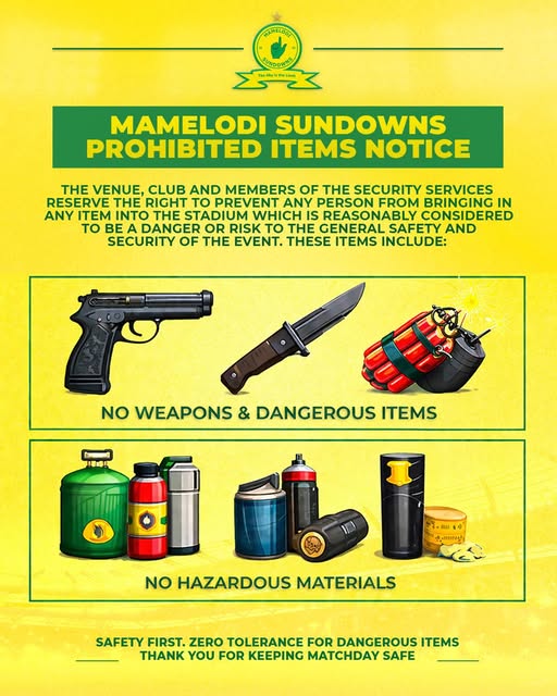 أصدر نادي ماميلودي صن داونز الجنوب إفريقي بلاغاً لجماهيره يتضمن قائمة بالمواد المحظور إدخالها إلى ملعب "لوفتوس فيرسفيلد"، وذلك قبيل المواجهة المرتقبة التي ستجمعه بالترجي الرياضي التونسي، غداً السبت 18 أفريل 2026، في إطار إياب نصف نهائي دوري أبطال أفريقيا 2026.
