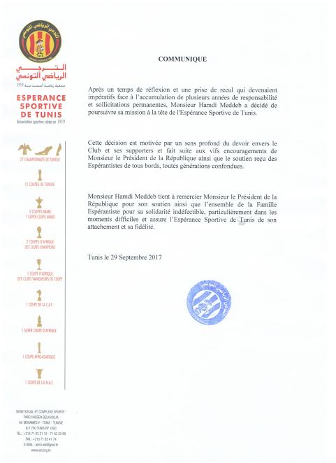 وفي ما يلي نصّ تراجع المدّب عن الاستقالة نشره موقع الترجي الرياضي التونسي