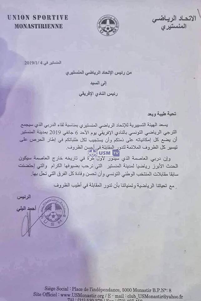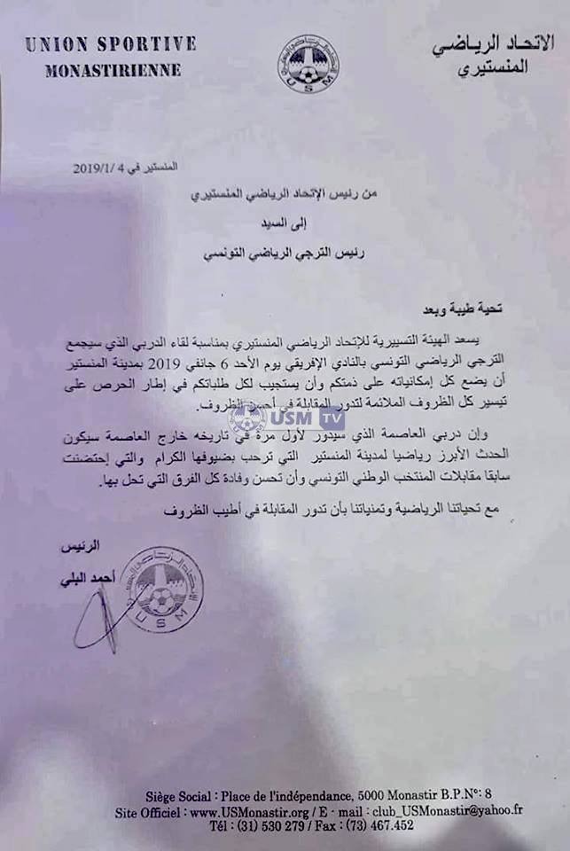 قامت هيئة الاتحاد الرياضي المنستيري بمراسلة إدراتي الترجي الرياضي التونسي والنادي الافريقي، معبرة من خلالها عن ترحيبها بالفريقين في ملعب مصطفى بن جنات لخوض لقاء دربي العاصمة يوم الاحد 6 جانفي، علما وان هذا الدربي سيقام لأول مرة خارج العاصمة .