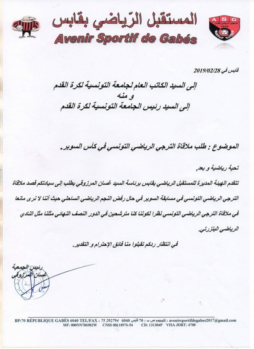 راسلت هيئة مستقبل قابس اليوم الخميس 28 فيفري 2019 الجامعة التونسية لكرة القدم من أجل السماح لها بملاقاة الترجي الرياضي التونسي في كأس السوبر بعد رفض النجم خوض اللقاء بسبب التزاماتها الرياضية.