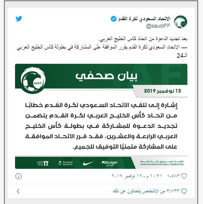 أعلن اتحاد كأس الخليج العربي لكرة القدم مشاركة منتخبات الإمارات والبحرين والسعودية في بطولة كأس الخليج العربي ''خليجي 24'' التي ستدور في قطر بداية من يوم 27 نوفمبر 2019.