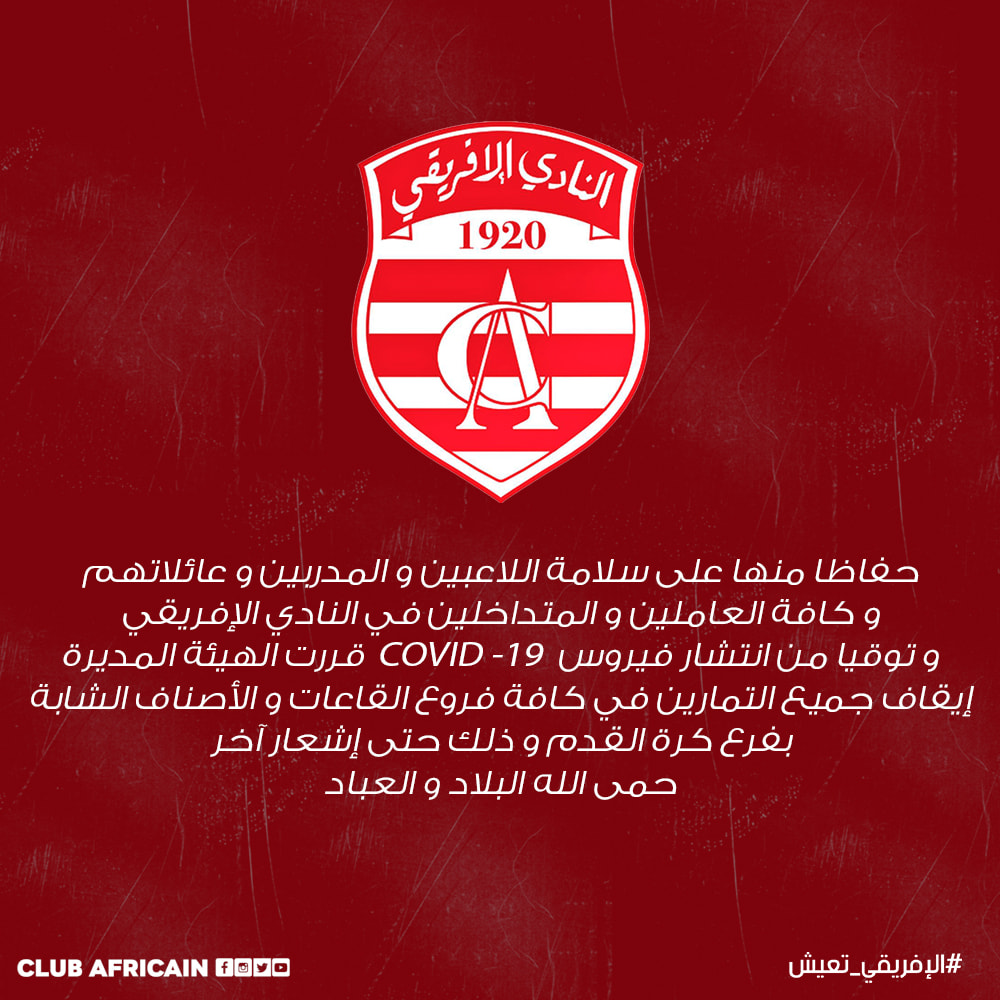 أعلن النادي الإفريقي إيقاف جميع التمارين في كافة فروع القاعات، إضافة إلى الأصناف الشابة بفرع كرة القدم وذلك حتى إشعار آخر، وذلك ضمن اجراء وقائي من فيروس كورونا (كوفيد 19).