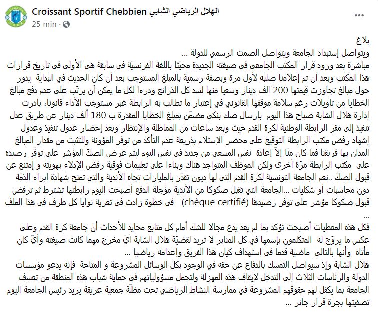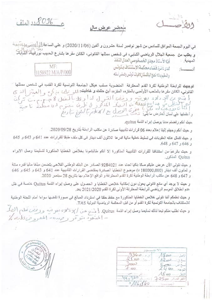 أصدرت إدارة نادي هلال الشابة اليوم الجمعة 6 نوفمبر 2020 بلاغا أكدت فيه ان الجامعة التونسية لكرة القدم "لا تريد لقضية هلال الشابة أي مخرج مهما كانت صيغته" وذلك بعد رفض الرابطة الوطنية لكرة القدم المحترفة قبول صكّ بقيمة 180 الف دينار بعنوان خلاص الخطايا المسلطة على الفريق.
