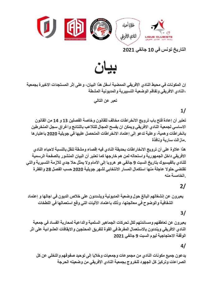 دعت مكونات في محيط النادي الإفريقي في بيان، وعلى خلفية المستجدات الأخيرة بالفريق وتفاقم الوضعية التسييرية والمديونية المشطة إلى توحيد الصفوف والتخلي عن كل الصراعات وتركيز الجهود للخروج بالنادي الإفريقي من وضعيته الحرجة.