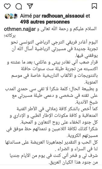 كتب المدرب المساعد السابق للترجي الرياضي التونسي عثمان النجار رسالة  وداع إلى كل عائلة الترجي، على خلفية قرار مغادرته للفريق في اتجاه الامارات لتدريب نادي دبا الحصن الذي ينشط في الدرجة الثانية.