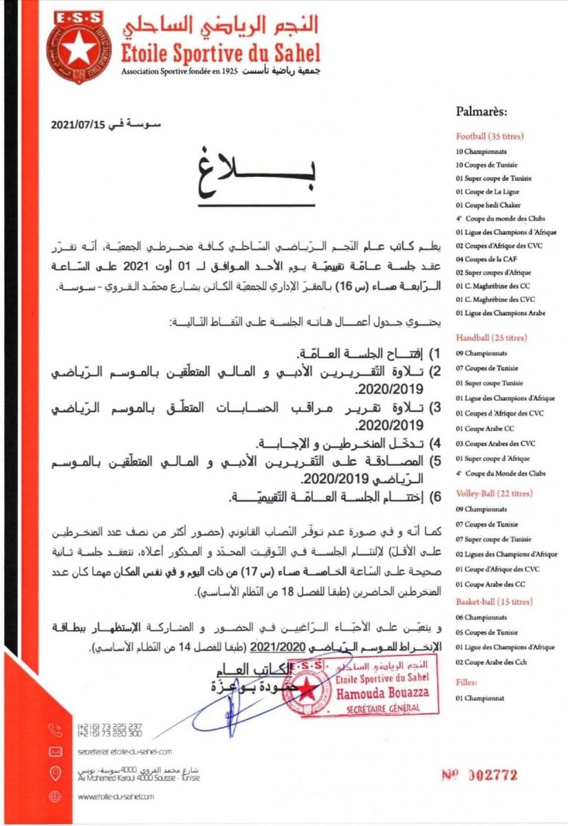 أعلنت الكتابة العامة للنجم الساحلي أن الجلسة العامة التقييمية ستعقد يوم الأحد 1 أوت 2021، وستم خلال هذه الجلسة تلاوة التقريرين المالي والأدبي للموسم الرياضي 2019/2020.