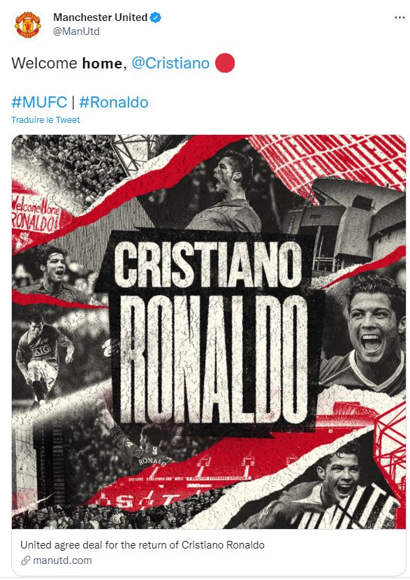 بعد الكثير من التشويق حول الوجهة الجديدة للاعب البرتغالي كريستيانو رونالدو، حُسم الأمر بعودته إلى في فريقه القديم مانشستر يونايتد، وذلك بعد انسحاب مانشستر سيتي من الصفقة.
