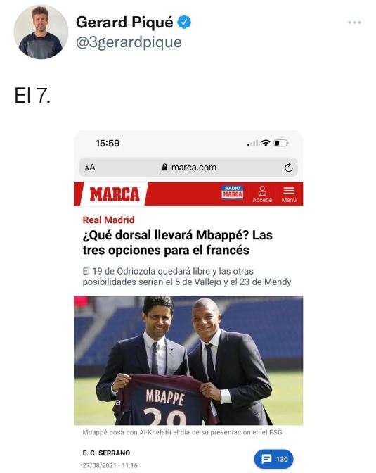 ومباشرة بعد إغلاق الميركاتو ليلة أمس، نشر مدافع برشلونة بيكيه صورة من المقال في تغريدة له على حسابه بتويتر مع رقم 7، في إشارة منه على فشل صفقة انتقال نجم منتخب فرنسا إلى الغريم مدريد و إلى الرقم الذي يرتديه مع ناديه الحالي باريس سان جرمان.